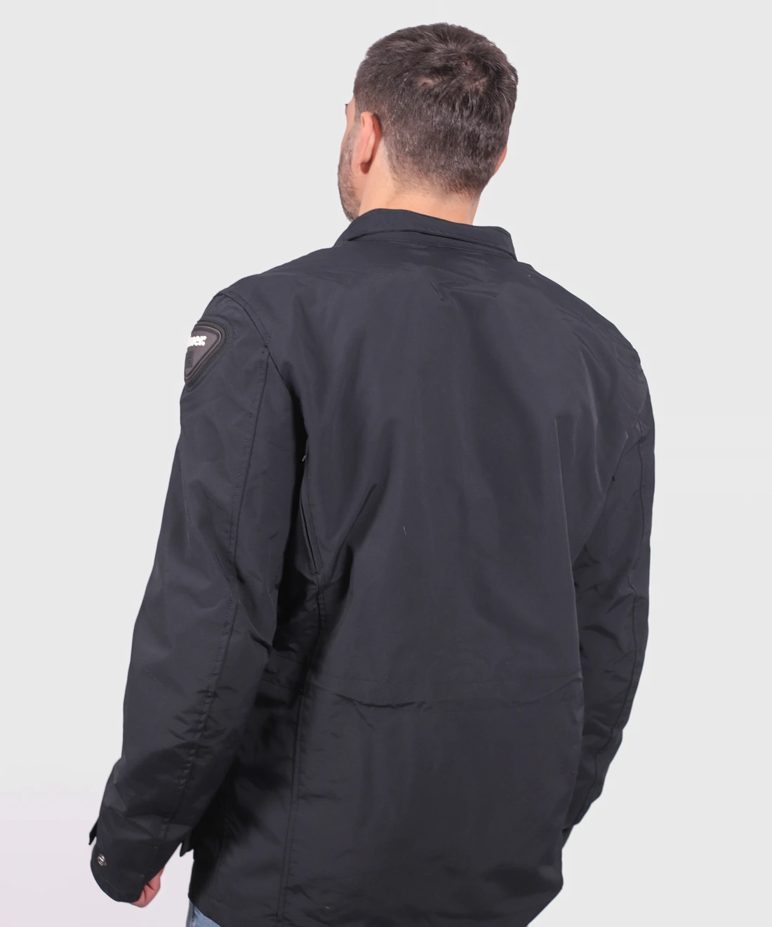 Confeccionada en nailon 100% hidrófugo de doble capa, la Ethan cuenta con protecciones en hombros y codos (incluidas) y bolsillo para protección de espalda (opcional). Su cierre frontal de doble cursor se complementa con botones a presión en la parte inferior y cuello, mientras que el cordón en la cintura permite ajustar el calce según el estilo o la temperatura.
